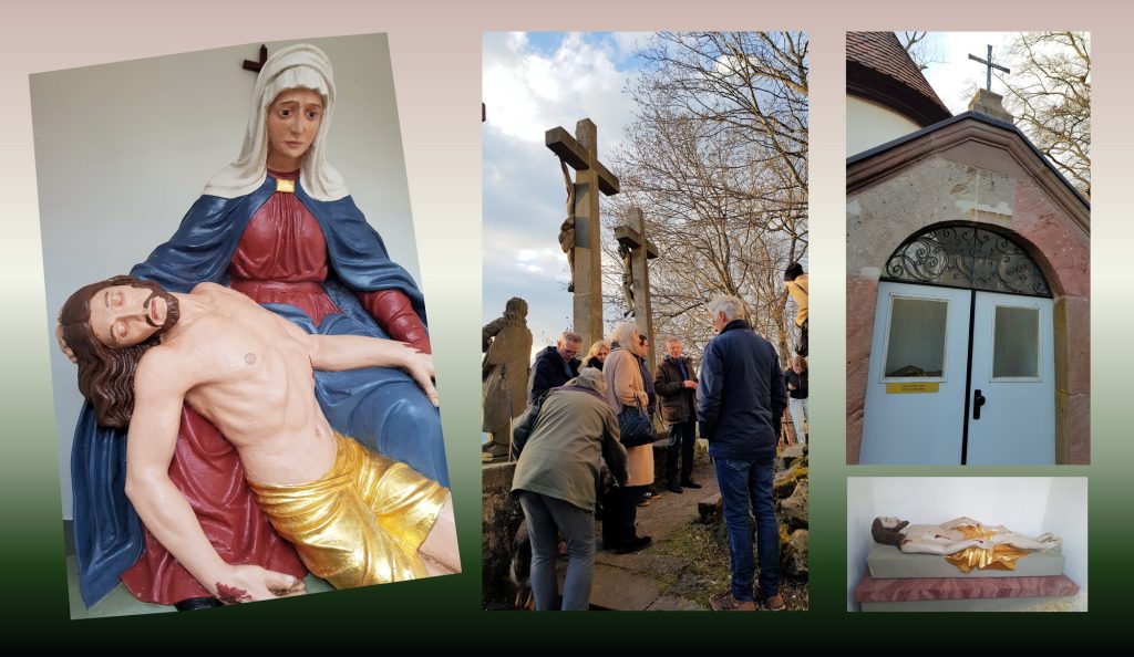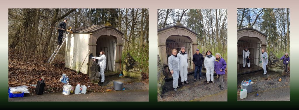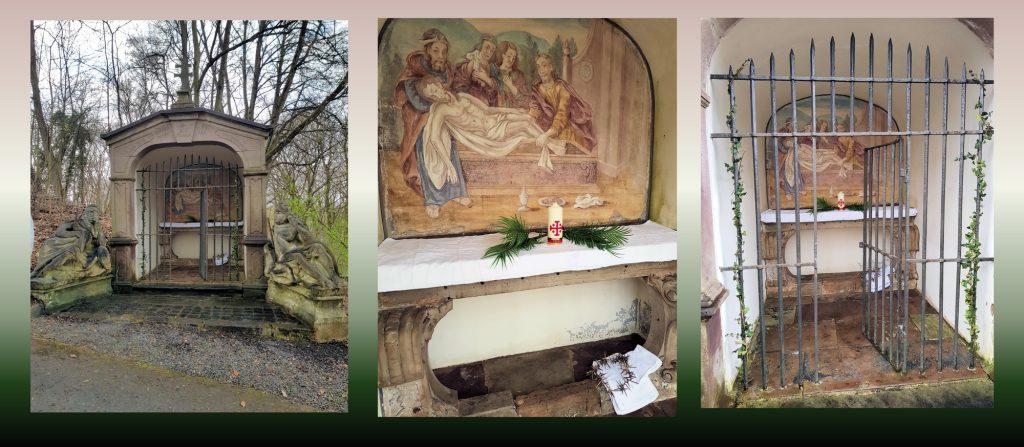 Mit Besen, Leitern, Schrubbern, Zahnbürsten und viel heißem Wasser bewaffnet rückte man am Samstag vor dem Passionssonntag Blättern, Unkraut und Moos zu Leibe, um die Nachbildung des Grabes Christi in einen andachtswürdigen Zustand zu bringen. Ordenskerze, Palmzweige, Leintücher und eine Dornenkrone – erstellt aus den am Einkehrtag der Provinz Rhein-Main im Park von St. Georgen gesammelten Dornen einer Gleditsia triacanthos – sollen den Betrachter noch tiefer in die Passionsgeschichte eintauchen lassen. Für die Mitglieder des Reinigungsteams ist diese Tätigkeit (labora) stets Auftakt zum gemeinsamen Beten des Kreuzwegs (ora) im Kreise der Komturei am darauffolgenden Tag.