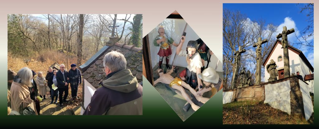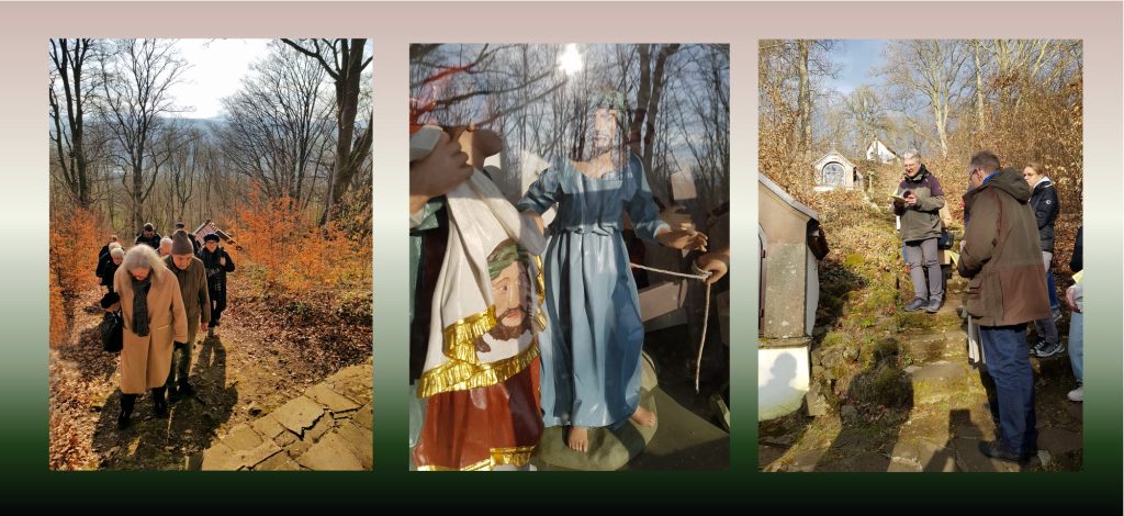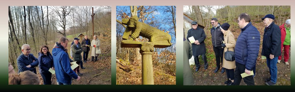 Wie auch in der Grabeskirche der Weg nach Golgatha über steile Stufen führt, so musste auch die Andachtsgruppe auf der Distanz von 300 Metern einen steilen Anstieg auf die 629 Meter hohe Basaltfelsgruppe bewältigen – gerade für ältere Komtureimitglieder ein forderndes Unterfangen, das aber durch tatkräftige ordensbrüderliche Unterstützung gemeistert werden konnte.